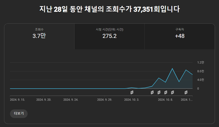 | 유튜브 쇼츠 채널 키우기 3주차 [조금씩 성과가 난다] (4) | 2024.10.26 |