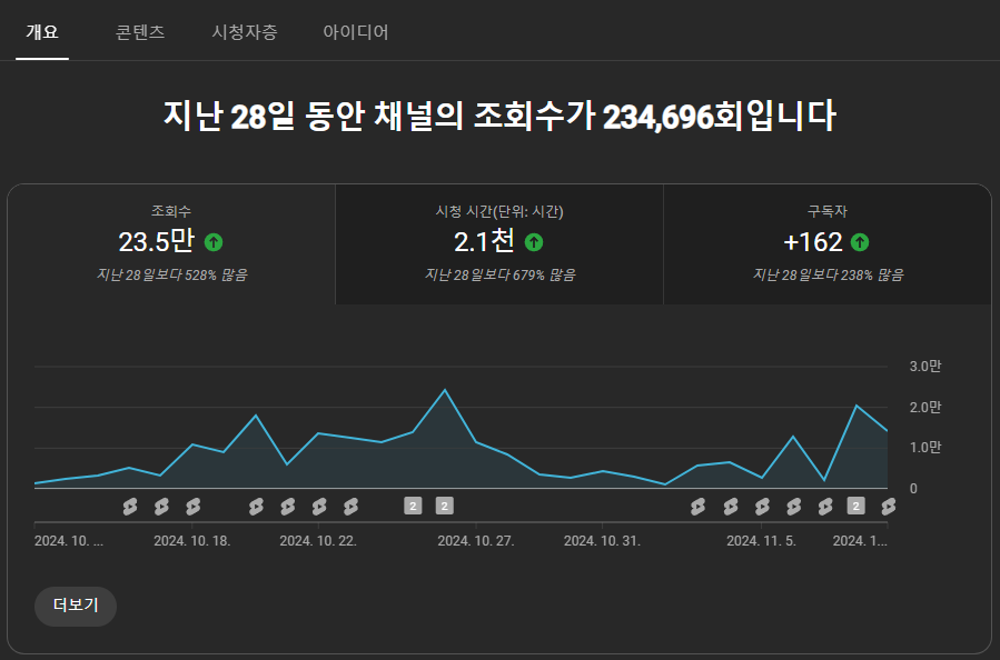 | 유튜브 쇼츠 채널 키우기 3주차 [조금씩 성과가 난다] (4) | 2024.10.26 |