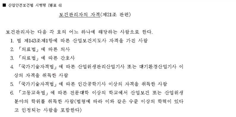 산업안전보건법 시행령에 보면 보건관리자의 자격 요건이 나온다. (해당 사항은 기업마다 다른 것이 아니다. 법으로 정해진 공통사항이다)