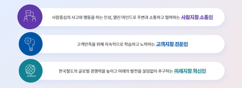 - 한국철도의 글로벌 경쟁력을 높이고 미래의 발전을 끊임없이 추구하는 미래지향 혁신인