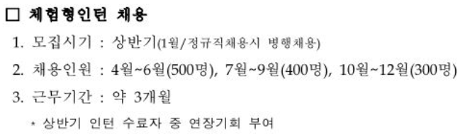 체험형 인턴도 예정되어 있다. 정규직 채용과 병행 채용 예정이며, 각 기간마다 1200명 규모로 약 3개월간 근무 가능하다.