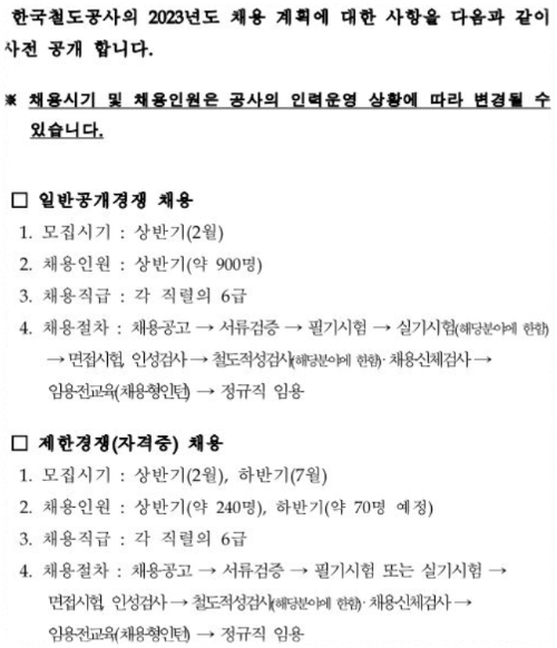 [한국철도공사 2023년 채용 계획 사전 공개]