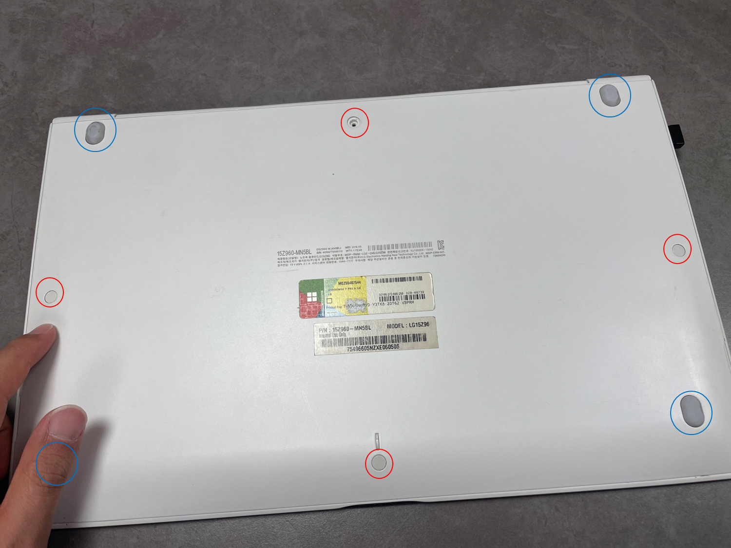 노트북 밑면에서 총 8개의 나사를 풀어내야 한다. 빨간색 동그라미는 플라스틱 커버가 씌어진 4곳과, 파란색 미끄럼 방지 패드가 있는 4곳이 대상이다.