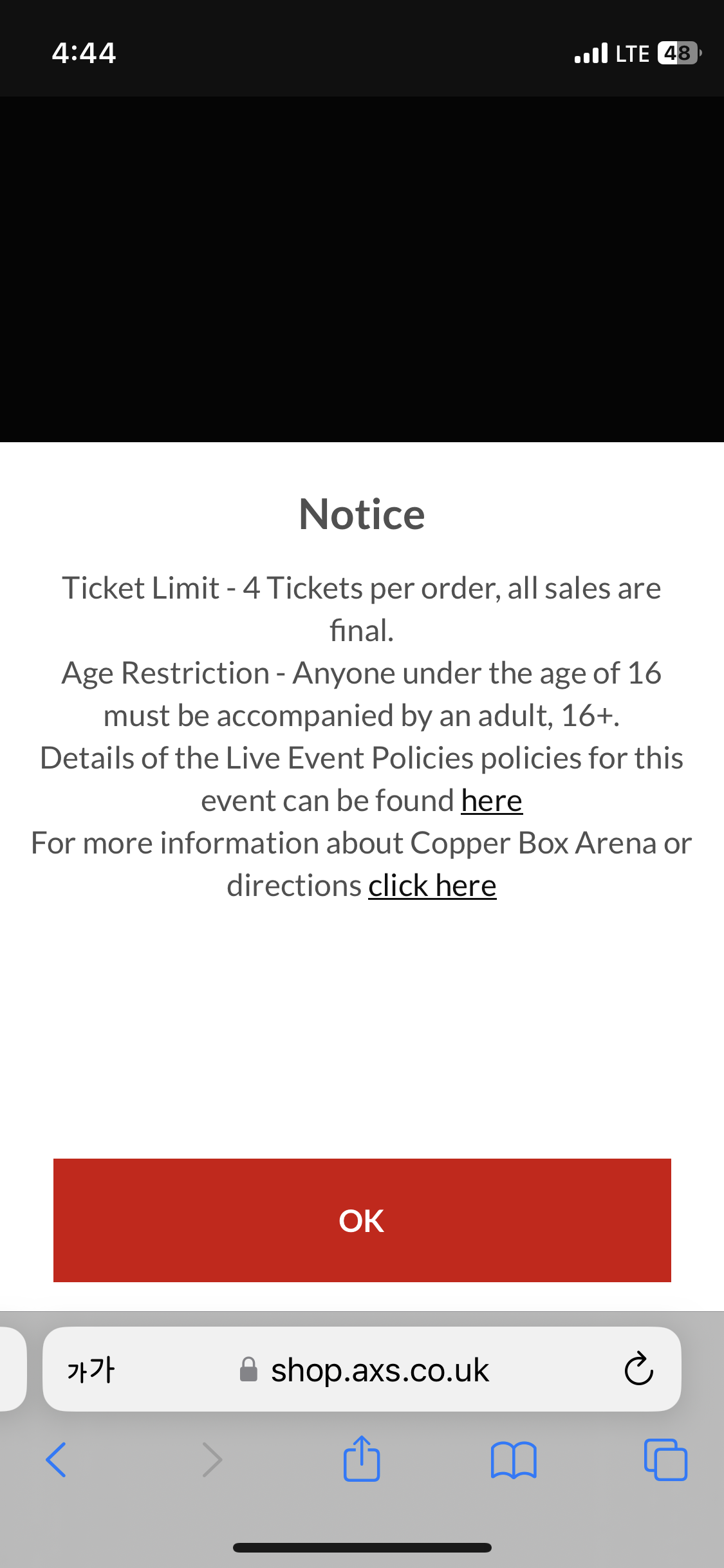 MSI를 검색해서 정보에 있는 "티켓예매"로 들어갑니다. 그런데도 오른쪽 화면처럼 AXS 사이트로 연결되면 와이파이를 끄고 다시 접속해봅니다.