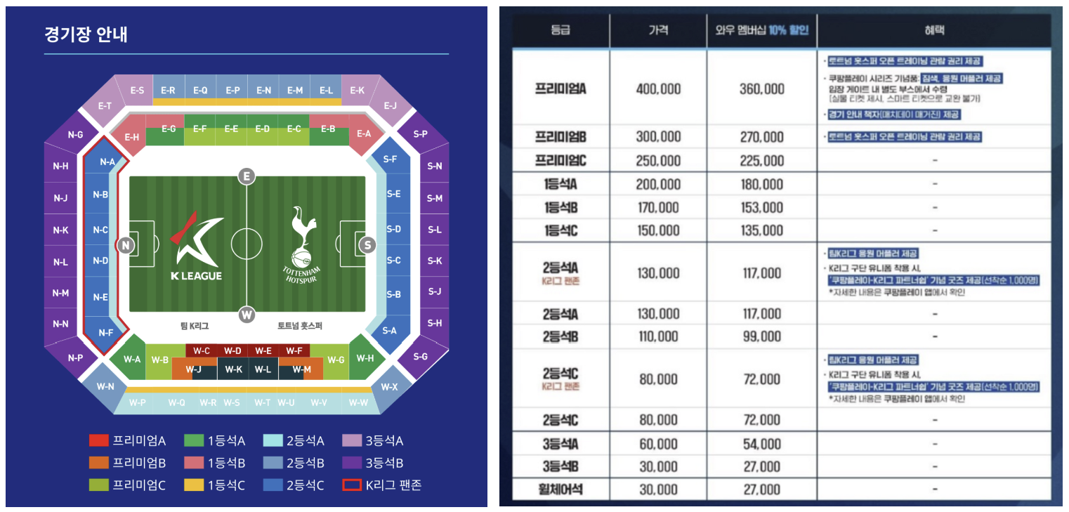 티켓 가격은 곧 오픈할 것으로 보인다. 인스타그램 쿠팡플레이에 올라올 것으로 보이며, 예전 토트넘 쿠팡플레이 내한했던 가격과 유사할 것으로 본다. 최고는 프리미엄A석 가격이 40만원이었고, 가장 저렴한 가격은 3등석 3만원까지 분포되어 있다. 얼마전 유럽 맨체스터에 가서 경기를 직관하고 왔는 데, 당시 가격이 10만원 초반대 가격이었던 점을 생각하면 쿠팡플레이 가격은 꽤나 비싼 편이다.