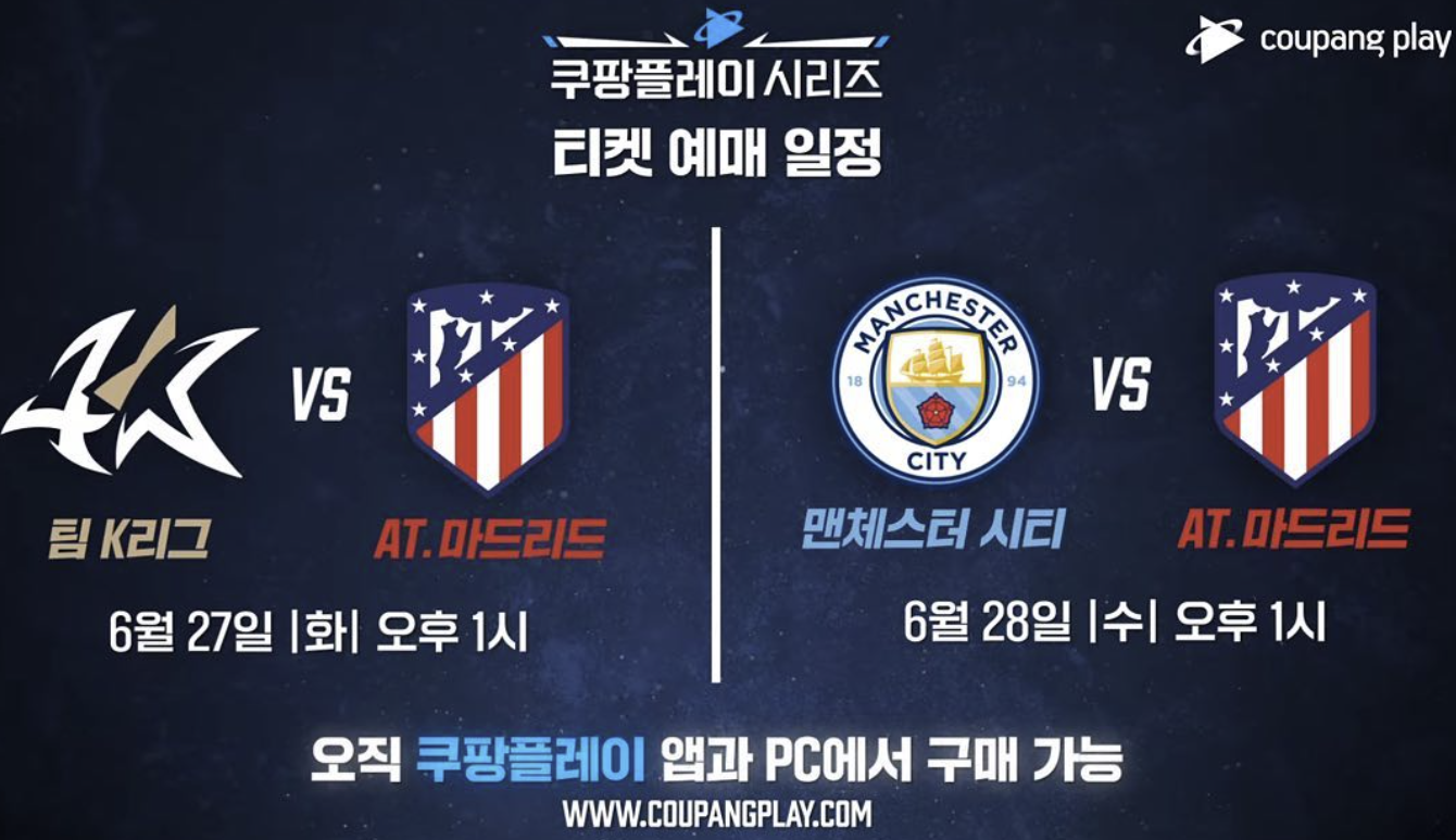 이번에 구단 최초로 트레블을 달성한 맨체스터시티, 이강인 이적이 유력한 아틀레티코 마드리드의 쿠팡플레이 주관 내한 정보 및 빠른 예매 방법 안내드립니다. 6월 국가대표 페루와 엘살바도르 평가전 (부산, 대전) 이후 진행되며, 이전에 토트넘 내한을 주관했던 쿠팡플레이에서 역시 주관하게 됩니다.