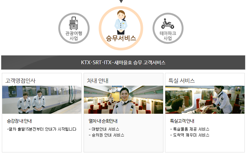 최고의 열차 승무서비스를 통해 여행이 더욱 즐겁고 편안하게 만든다. 서비스 매뉴얼에 기초한 체계적이고 조직적인 관리는 물론 승무원들의 현장 경험과 고객 니즈를 지속반영하여 고객감동을 실현하다.