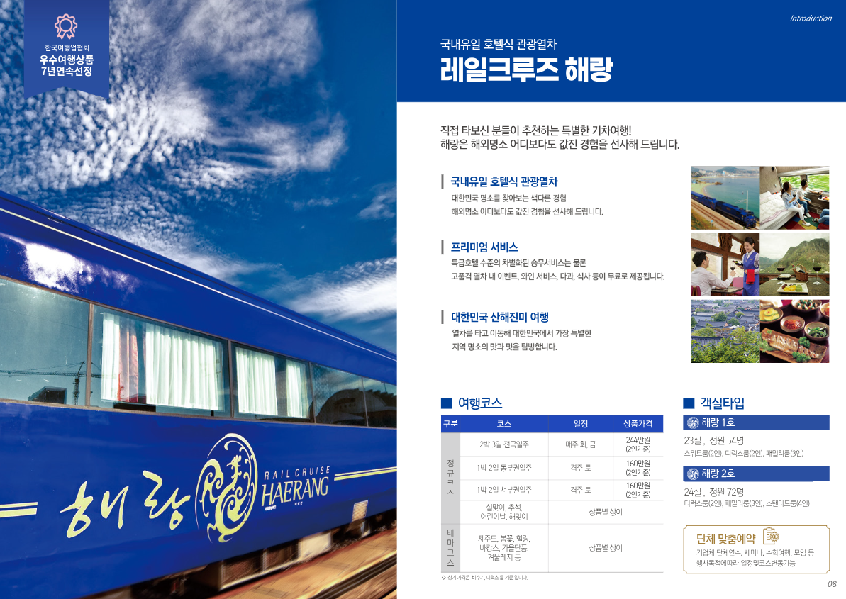 체계적인 품질 관리를 통해 우수여행 상품으로 인증받고 있으며, 지역과 상생하는 기차 여행으로 사회적 가치와 고객만족을 실현한다. 국내외 특화된 열차 인프라와 수년간 관광열차 운영 노하우로 차별화된 기차여행 컨텐츠를 제공하고 있다.