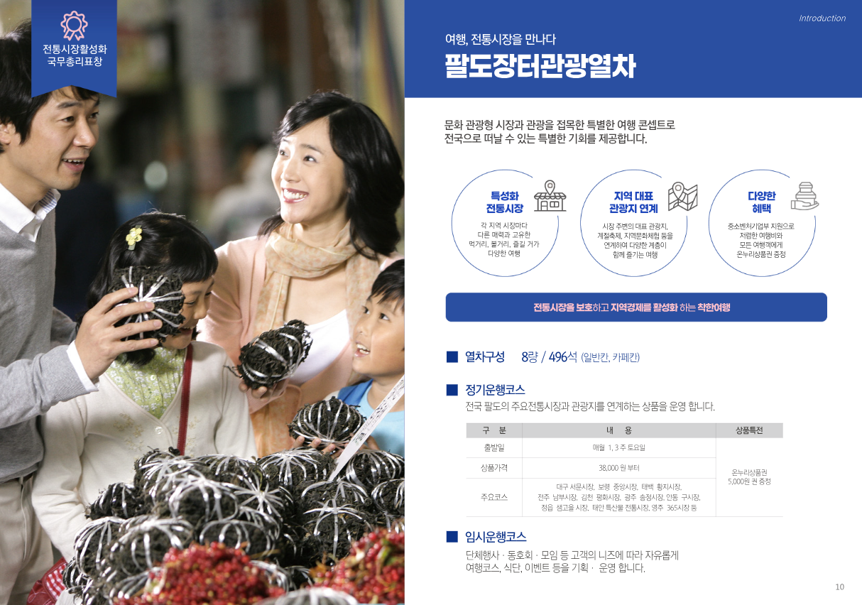 대한민국 각 지역의 특색있는 명소, 지방문화, 축제가 만나 새로운 여행문화로 거듭나고 지역방문 관광객 확대를 통한 지역경제 활성화와 새로운 기차 테마 여행을 만들어 간다.