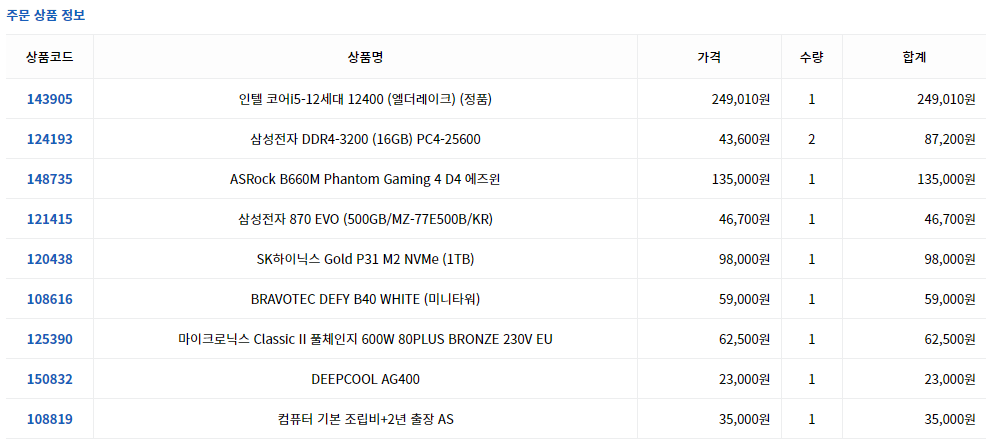 RAM은 16G 2개로 32G로 구성했고, 제품 안정성을 고려하여 삼성을 선택했다. 마이크론 등 다른 제조사도 선택이 가능했지만 아무래도 삼성이 제일 낫다. SSD는 하이닉스 M.2 1T 제품과 삼성 870 EVO를 선택했다. 케이스가 조금 특이한데, 잇섭님의 미니PC 영상을 보고 뽐뿌가 너무 와서 브라보텍 DEFY B40 제품 화이트로 선택했다. 파워도 DEEPCOOL AG400을 선택했다. PALADIN 쿨러와 AG400 쿨러 제품 추천이 가장 많았다. 공랭 쿨러 중에 RGB LED 달린 제품이 많았는데, 촌스러워 보여서 노 LED 제품으로 선택했다.