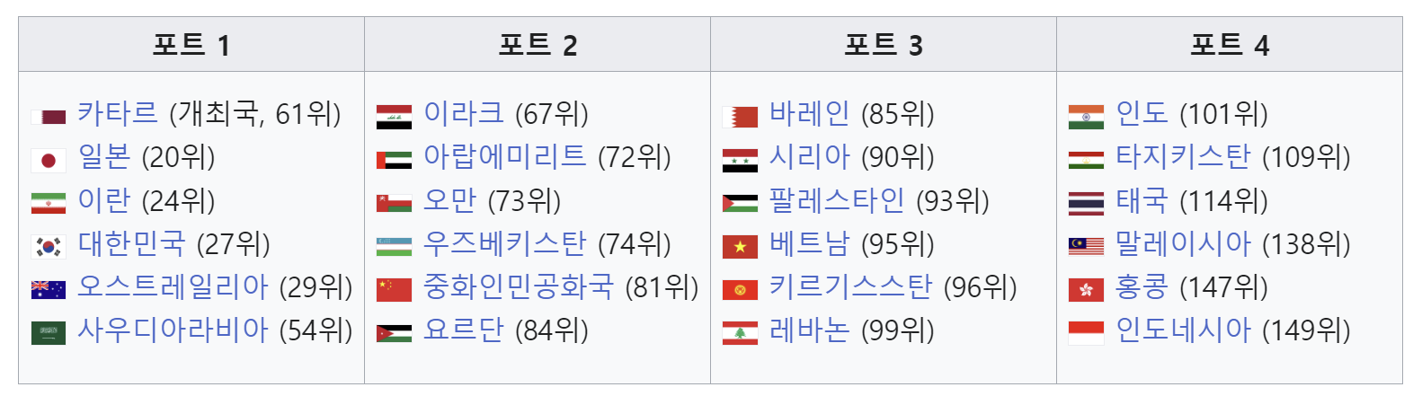 대한민국은 포트1이 배정되었으며, 포트 배정은 2023년 4월 피파랭킹 기준으로 결정되었습니다. 2019년 대회부터 본선 참가국이 16개국에서 24개국으로 늘어나면서 진출권 배정 방식이 대폭 변경되었으며, 이에 따라 개최국만 자동 본선 진출권을 가지게 되었습니다. 또한 FIFA 월드컵 아시아 지역 최종 예선에 진출한 12개국도 AFC 아시안컵 예선을 치르지 않고 본선 진출권을 가지게 됩니다.
