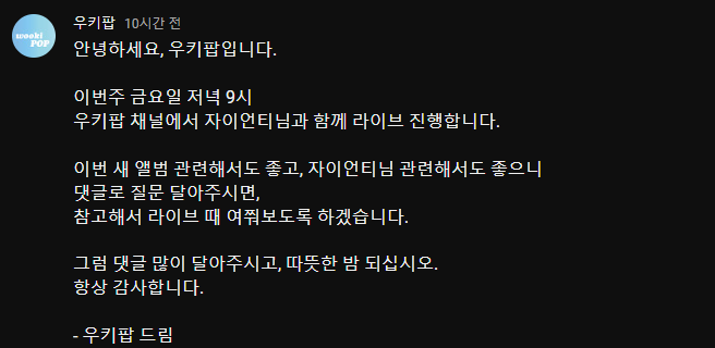 자이언티는 오늘(7일) 저녁 6시 유튜브 '빙고뮤직'에 킬링보이스가 공개될 예정이다. 물론 촬영은 이미 이전에 촬영했을 것이고, 공개된다는 것이다. 또, 내일(8일) 저녁 9시에 유튜브 '우키팝' 채널에도 출연 예정이다. 이번 새앨범 관련해서 궁금한 점을 댓글로 달면 라이브때 물어봐 주신다고 한다.